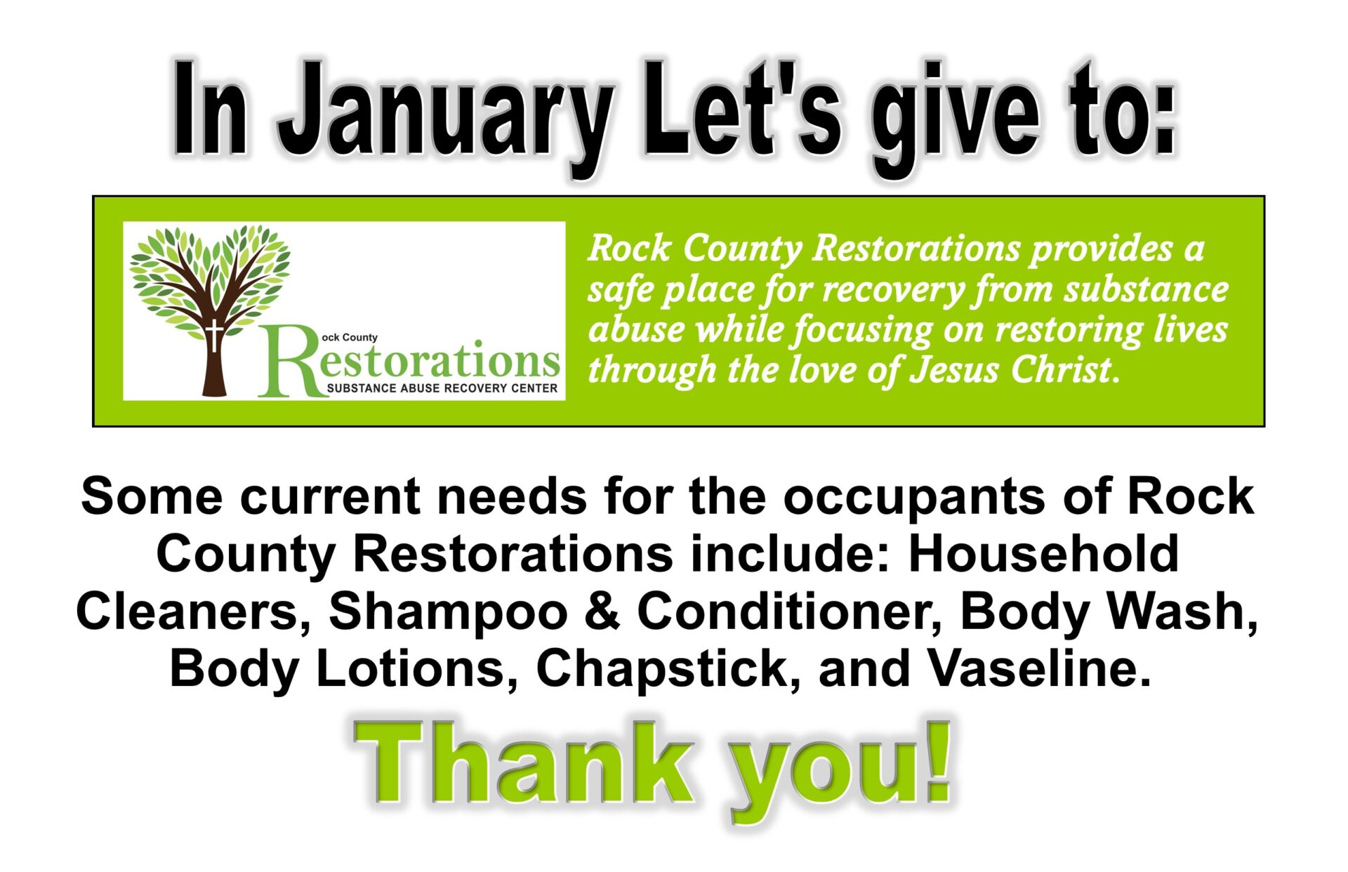This month, let’s give to Rock County Restorations, a substance abuse recovery center.